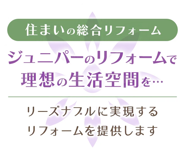 ジュニパーホームは、あなたの暮らしに寄り添い、心地よい空間を提供します。戸建てやマンションなど、さまざまな住宅のニーズにお応えいたします。部屋を広くしたい、壁紙を変えたい、防犯対策を考えたい、災害で受けたダメージを修復したいなど、どんなご要望もお気軽にお申し付けください。これまでの実績をもとに、あなたにぴったりのプランをご提案します!